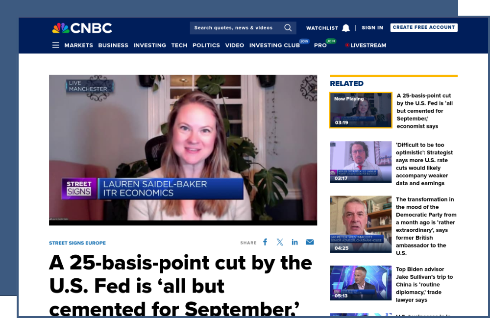 As always, relevant and timely pitching paid off. ITR economists were being cited in high-level outlets like Forbes, CNN, Bloomberg BNN, MarketWatch, and the Epoch Times before long. The freshly media-trained economists began climbing the ranks of financial TV in the meantime, with economist Lauren Saidel-Baker showing particular promise despite her very limited experience. Razor Sharp PR recognized this momentum and began working to capitalize on her talent. After just a few months, Saidel-Baker had appeared on both Bloomberg TV, Schwab TV, and Reuters TV—with her calendar becoming fuller by the week.
